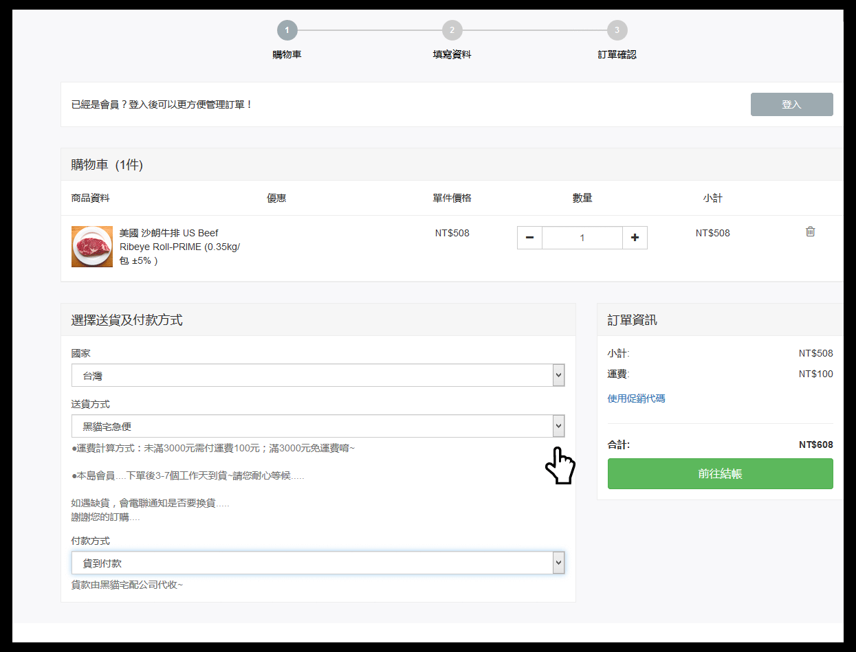 步驟(3). 選擇「送貨方式」與「付款方式」