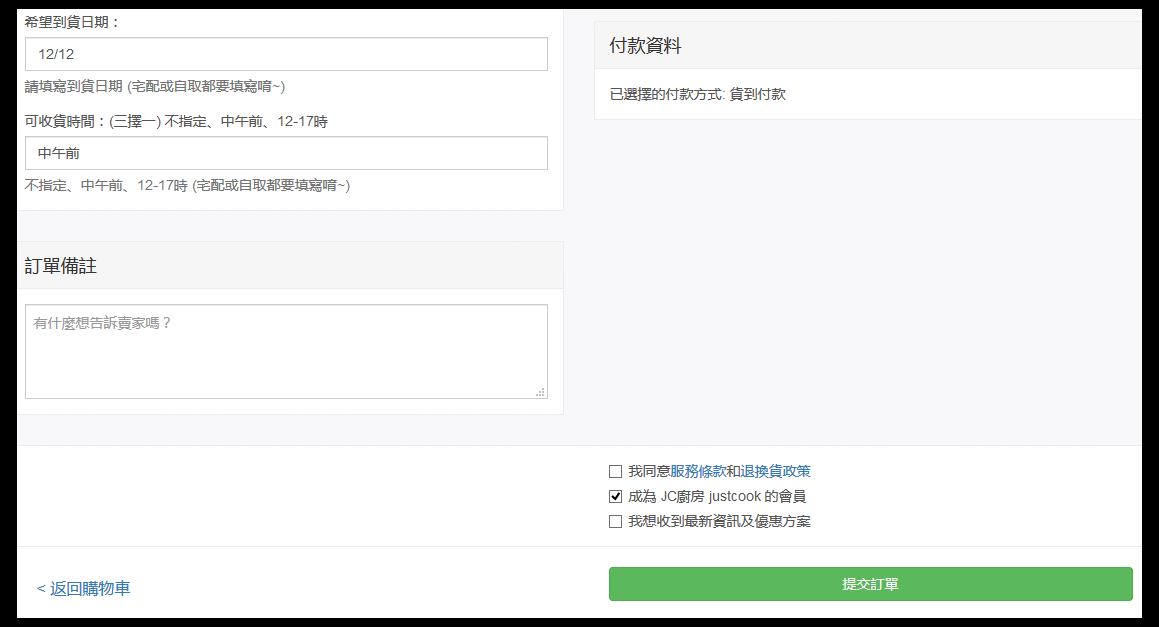 並勾選「我同意服務條款和退換貨政策」、「我想收到最新資訊及優惠方案」, 提交訂單完成購買。