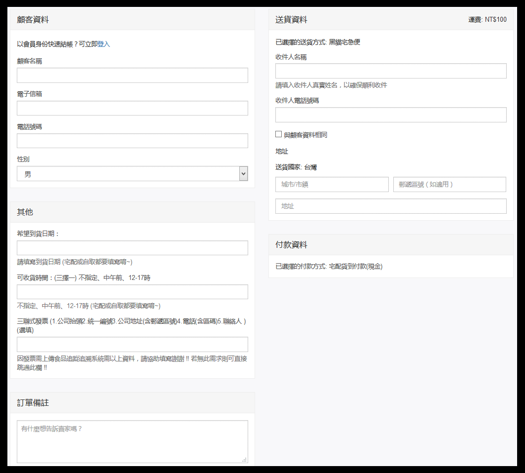 『送貨方式』:黑貓宅配、黑貓宅配離島運費(外島限定)、門市取貨...等選擇。